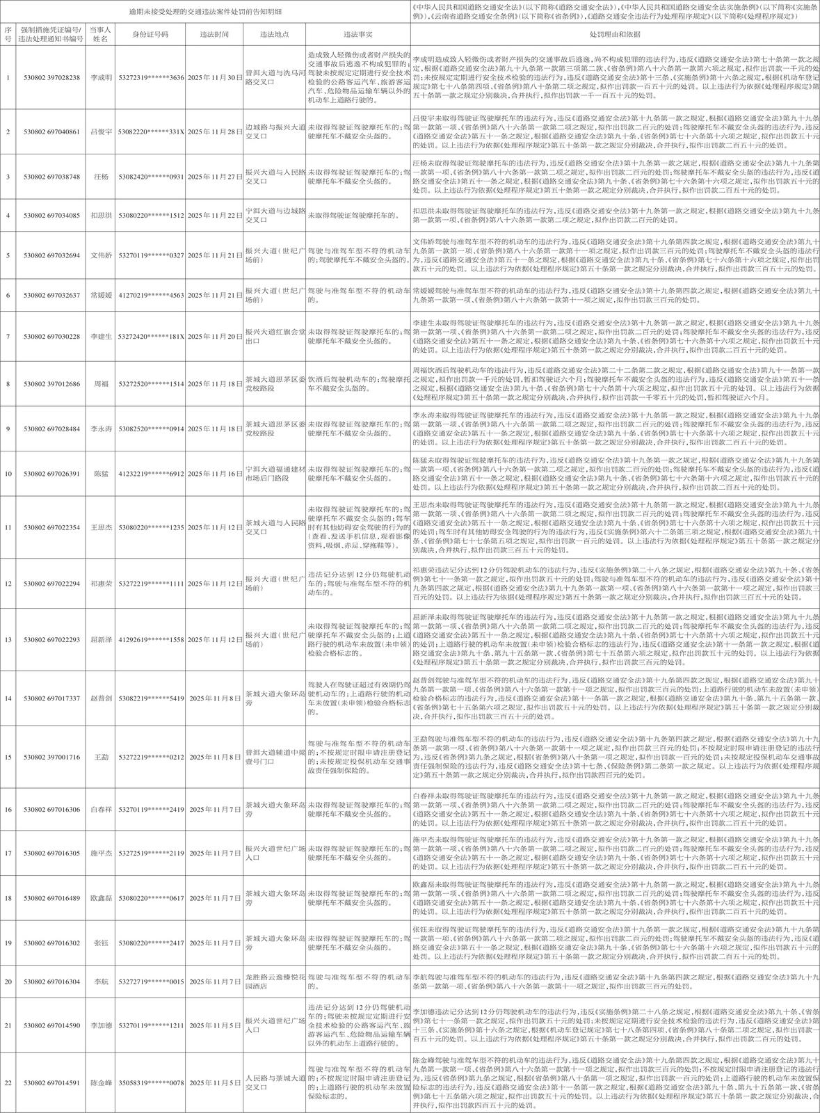 2025年11月1日至30日,下列违法行为人在思茅辖区内因交通违法行为被普洱市公安局思茅分局交通管理大队执勤民警查获,并开具了《公安交通管理行政强制措施凭证》或《道路交通安全违法行为处理通知书》。经依法电话告知后,违法行为当事人无正当理由均未在规定期限内到公安交通管理部门接受处理,且未提出延期处理申请。依据《中华人民共和国行政处罚法》第四十四条、第四十五条,《公安机关办理行政案件程序规定》第一百六十七条、第一百六十八条,以及《道路交通安全违法行为处理程序规定》第五十四条第一款之规定,现将拟作出行政处罚决定书的事实、理由、依据及依法享受的权利进行公告,公告期为7日(2026年1月26日至2026年2月1日)。